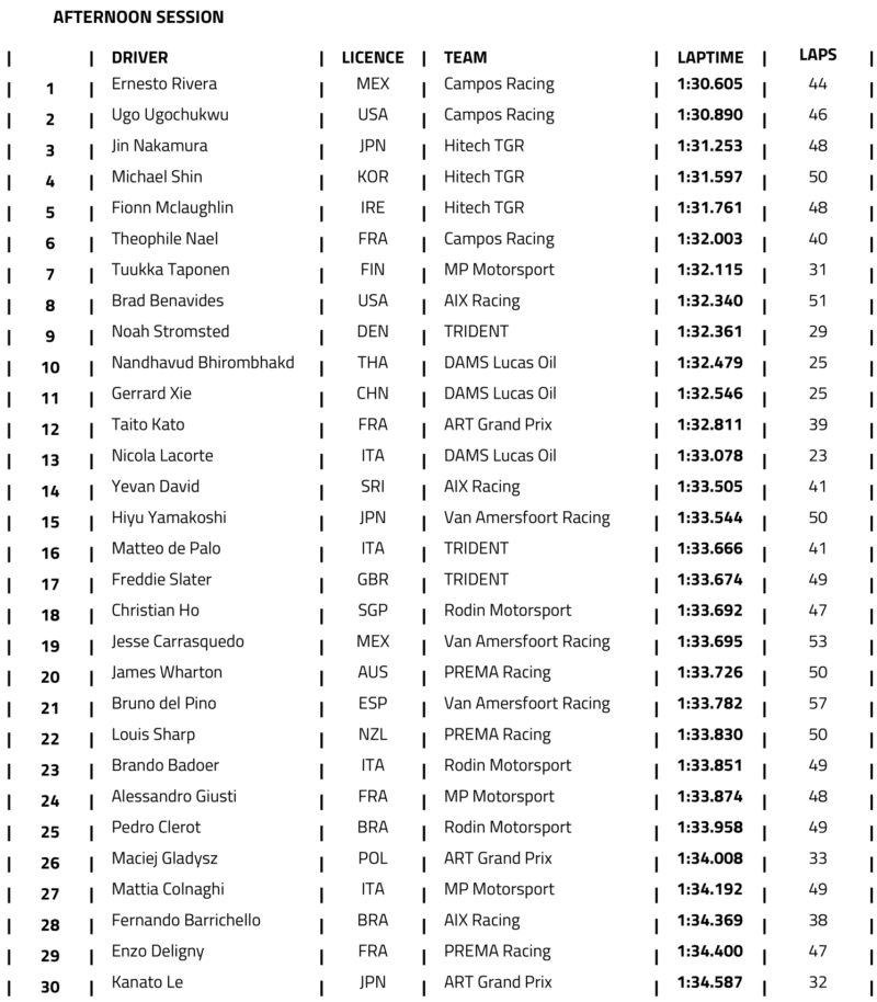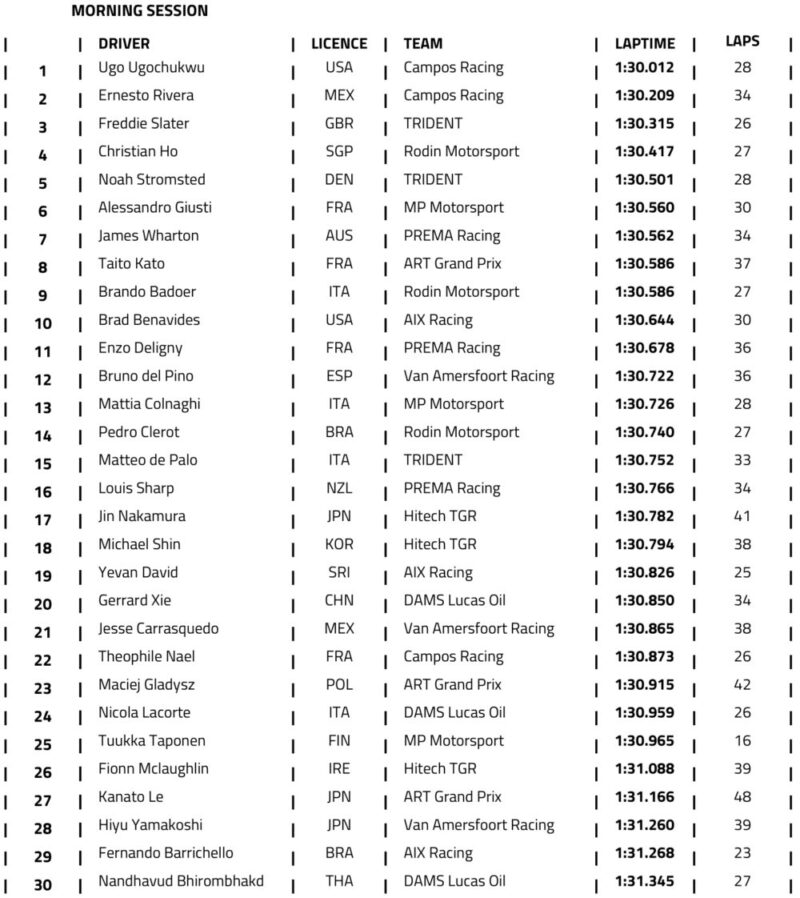 W obu dzisiejszych sesjach najlepsze czasy uzyskiwali kierowcy Camposa – najpierw Ugo Ugochukwu (najlepszy czas całych testów), a potem Ernesto Rivera.