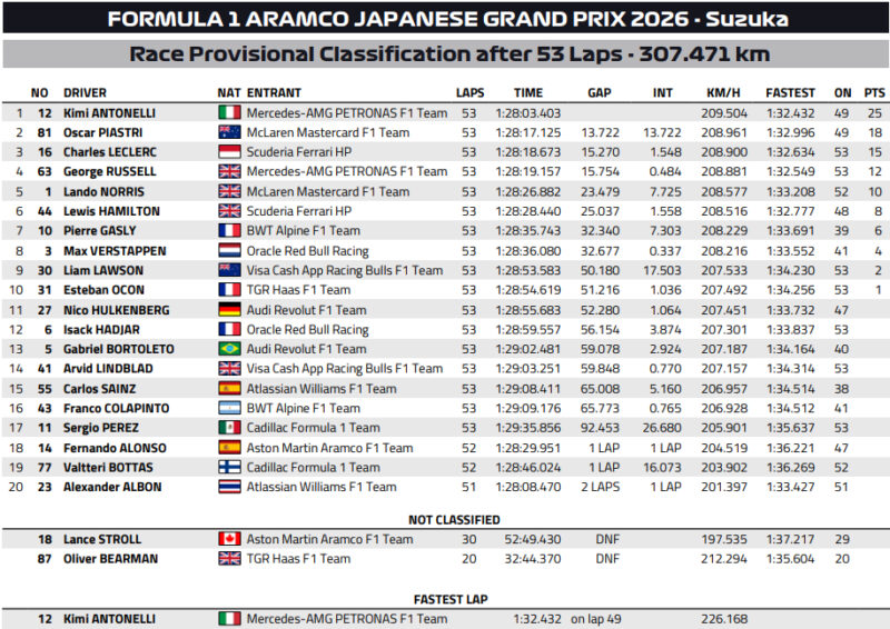 Tak wyglądają wyniki GP Japonii 2026 Formuły 1: