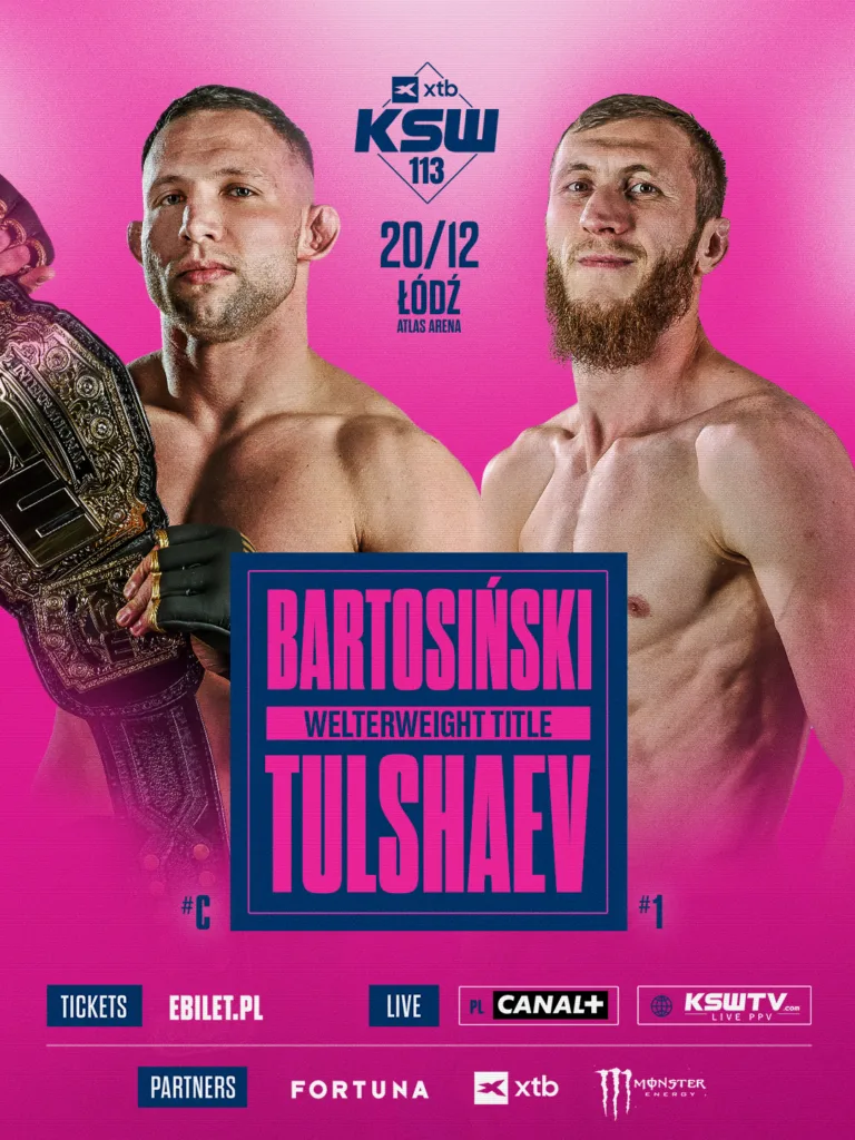 W walce wieczoru gali XTB KSW 113 dojdzie do mistrzowskiej konfrontacji o pas wagi półśredniej. W starciu tym czempion i dominator tej kategorii w KSW, Adrian Bartosiński (16-1, 11 KO, 2 Sub), zetrze się z niepokonanym w okrągłej klatce numerem jeden, Muslimem Tulshaevem (14-3, 6 KO, 5 Sub). Do walki dojdzie 20 grudnia w łódzkiej Atlas Arenie.