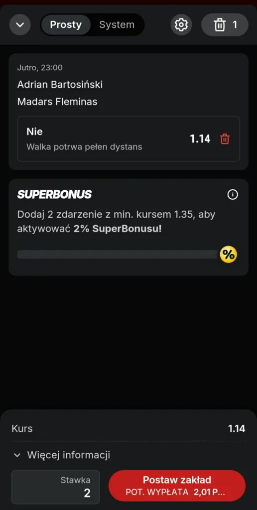 Tak powinien prezentować się Twój zakład.Pamiętaj, aby nie pominąć żadnego kroku. Cały regulamin promocji „Bonus 360 PLN, jeżeli walka Adrian Bartosiński – Madars Fleminas zakończy się przed czasem” znajdziesz w TYM MIEJSCU. Promocja obowiązuje w okresie od dnia 12.03.2026 r. do dnia 14.03.2026 r. W razie wątpliwości zawsze możesz skontaktować się z działem obsługi klienta Superbet, który jest dostępny przez całą dobę, 7 dni w tygodniu.