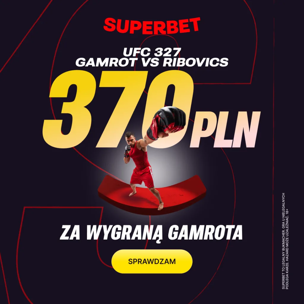 Tak powinien prezentować się Twój zakład.Powyższa oferta jest przeznaczona wyłącznie dla osób, które ukończyły 18. rok życia i nie posiadały wcześniej konta w Superbet. Promocja „Bonus 370 PLN za zwycięstwo Mateusza Gamrota w walce z Estebanem Ribovicsem na gali UFC 327” obowiązuje w okresie od dnia 08.04.2026 r. do dnia 12.04.2026 r. W razie wątpliwości zawsze możesz zapoznać się z regulaminem promocji, który jest dostępny w TYM MIEJSCU, lub skontaktować się z działem obsługi klienta Superbet dostępnym przez całą dobę, 7 dni w tygodniu.