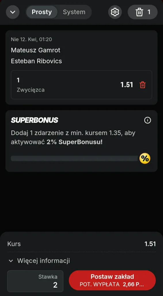 3. Dokonaj pierwszej wpłaty na konto gracza Superbet w wysokości co najmniej 50 PLN, a następnie postaw pierwszy kupon za minimalną stawkę 2 PLN na wygraną Mateusza Gamrota w starciu z Estebanem Ribovicsem.