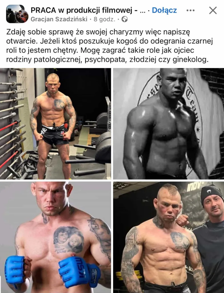 W tym roku Gracjan Szadziński chce jednak spróbować nowych sił. Były zawodnik KSW chce odnaleźć się w filmie, a swoją propozycję zamieścił choćby na grupie facebookowej dotyczącej pracy w produkcji filmowej.