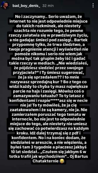 „Nie wiedziałeś, iż pójdziesz siedzieć przez swojego przyjaciela?” Ty śmiesz sugerować, iż ja się sprzedałem?! To mnie nazywasz sprzedającą kur? Bo z tego co widzi każdy, to chyba ty masz największe parcie na hajs i zasięgi. Mówisz coś o zamazywaniu tatuażu? To ty latasz z konfidentami i rozpie*dalasz się w necie, nie ja! To ty mówiłeś, iż ja cię zaatakowałem i iż są kamery, nie ja. Nie zamierzałem poruszać tego tematu w internecie, bo nie jest to odpowiednie miejsce do tego, ale niestety nie umiesz się zachować, co potwierdzasz na każdym kroku. Idź dalej, trzymaj się z pdf i konfidentem. No i na koniec dodam, iż siedziałeś w areszcie, a nie w więzieniu, a byłeś tam 3 tygodnie, a płaczesz jakbyś 10 lat siedział… „Czułem się jakbym 6 w totka trafił jak wychodziłem”. Oj Bartuś, charakternie.