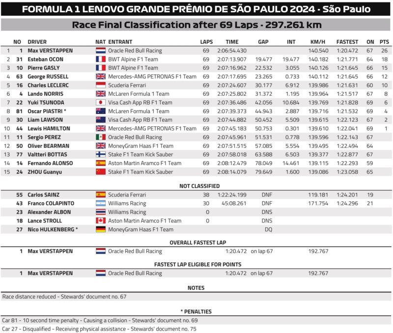 Tor Interlagos liczy 4309 metrów i jest jednym z najkrótszych w kalendarzu F1. Składa się z 15 zakrętów. Kierowcy przejadą po nim w tym roku 71 okrążeń, co przełoży się na 305,909 km dystansu wyścigowego.