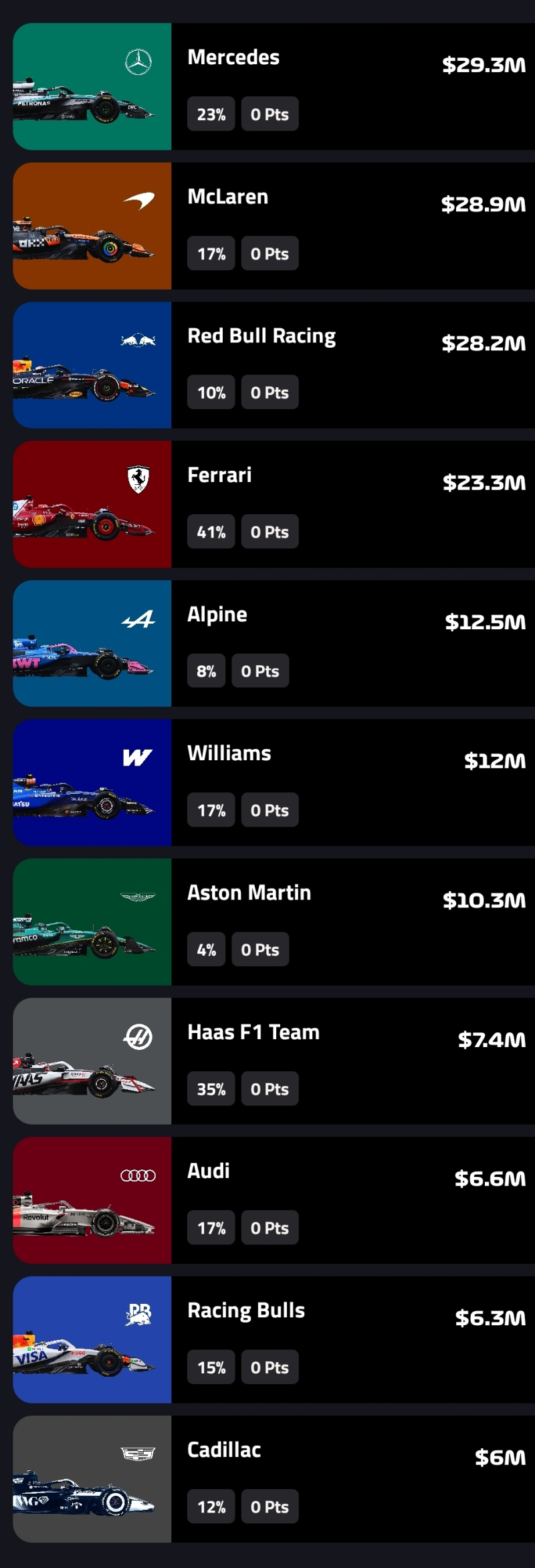 Do dyspozycji mamy budżet w wysokości 100 milionów dolarów. Za tę kwotę możemy kupić maksymalnie 5 kierowców oraz 2 zespoły. Oczywiście ceny kierowców i zespołów są zależne od ich obecnej formy. Jednemu z naszych kierowców możemy przyznać “DRS Boost” co sprawia, iż będzie on dla nas punktował podwójnie.