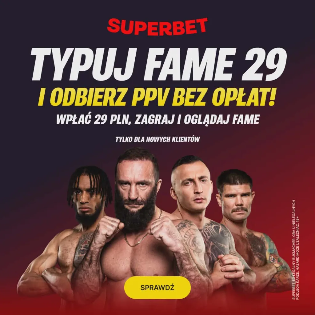 Legalny bukmacher Superbet przygotował kapitalną promocję dla nowych użytkowników, którzy założą konto z kodem MMAPLFAME. Wystarczą trzy proste kroki, aby odebrać PPV na nadchodzącą galę FAME 29.