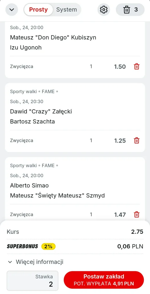 - Dokonaj pierwszej wpłaty na konto gracza Superbetna kwotę nie mniejszą niż 29 PLN, a następnie postaw dowolny zakład zawierający zdarzenia z oferty na FAME 29 za minimum 2 PLN (z wpłaconych środków musisz wykorzystać jedynie dwa złote – resztę możesz wypłacić lub przeznaczyć na dalszą grę). W ten sposób zdobędziesz PPV na galę FAME 29 w najkorzystniejszej cenie.