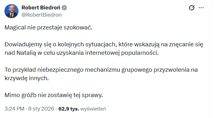 — Dominik Wałbrzych (@FryzjerMurana) January 8, 2026Teraz w sprawę Magicala zaangażował się Europoseł i były poseł na Sejm – Robert Biedroń. Na portalu X zarzeka, iż zajmie się sprawą patostreamera z Torunia: