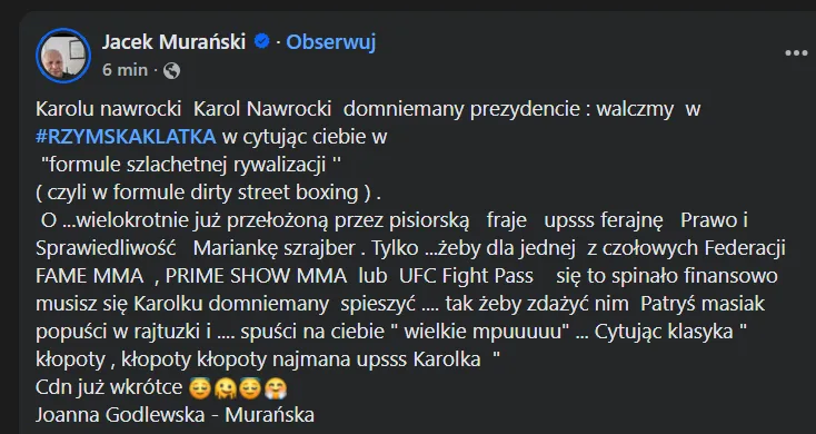 Murański jest wielkim przeciwnikiem Karola Nawrockiego, ale teraz chce być jeszcze jego przeciwnikiem w klatce. „Muran” zamieścił w sieci poniższy wpis, który jest podpisany przez jego małżonkę, więc możliwe też, iż to Joanna Godlewska Murańska stoi za tym, co możemy przeczytać poniżej: