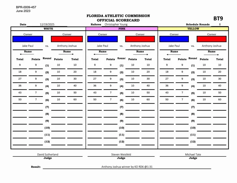 W miniony poniedziałek Florida Athletic Commission udostępniła serwisowi MMA Fighting karty punktowe z walki Paul vs Joshua, które pokazały punktację runda po rundzie w tym starciu w wadze ciężkiej. Sędziami punktującymi pojedynek byli David Sutherland, Steve Weisfeld i Michael Tate.