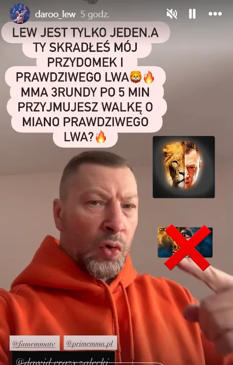 Dawidzie Załęcki, skradłeś mi przydomek starego Lwa i musimy zawalczyć o miano Lwa, prawdziwego Lwa w MMA oczywiście. Pamiętasz, jak mi proponowałeś walkę na High League? Skradłeś mi przydomek, jest mi z tego powodu przykro, więc trzeba to wyjaśnić – walka o miano Lwa.