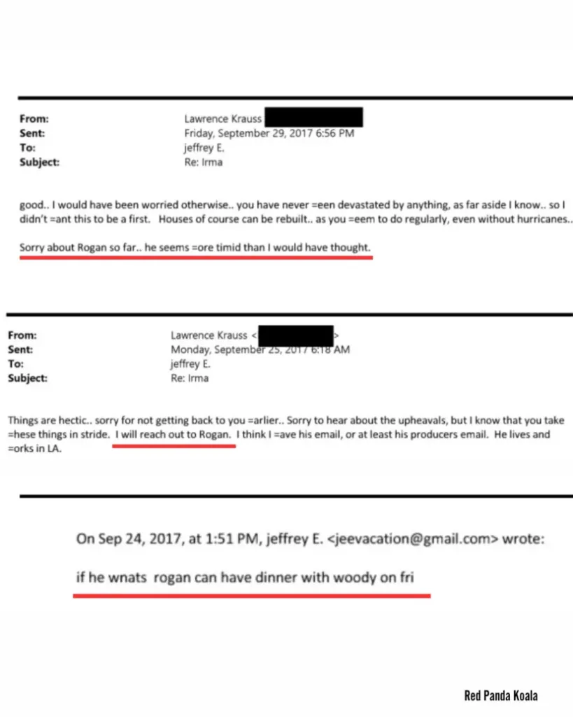 Nazwisko Rogana pojawiło się w dokumentach po tym, jak jeden z byłych gości jego podcastu próbował zorganizować spotkanie między nim a Epsteinem. Lawrence Krauss, znany fizyk i kosmolog, wymieniał w 2017 roku e-maile z Epsteinem, w których został zapytany o możliwość zorganizowania kolacji z Roganem.