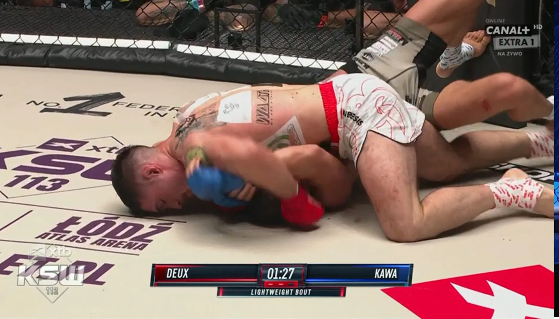 Niewiele czasu potrzebował Deux, by sprowadzić walkę do parteru w drugiej rundzie. „Nemesis” znakomicie kontrolował pozycję. Pozycja boczna, kolejne ciosy – całkowita dominacja w klatce.
