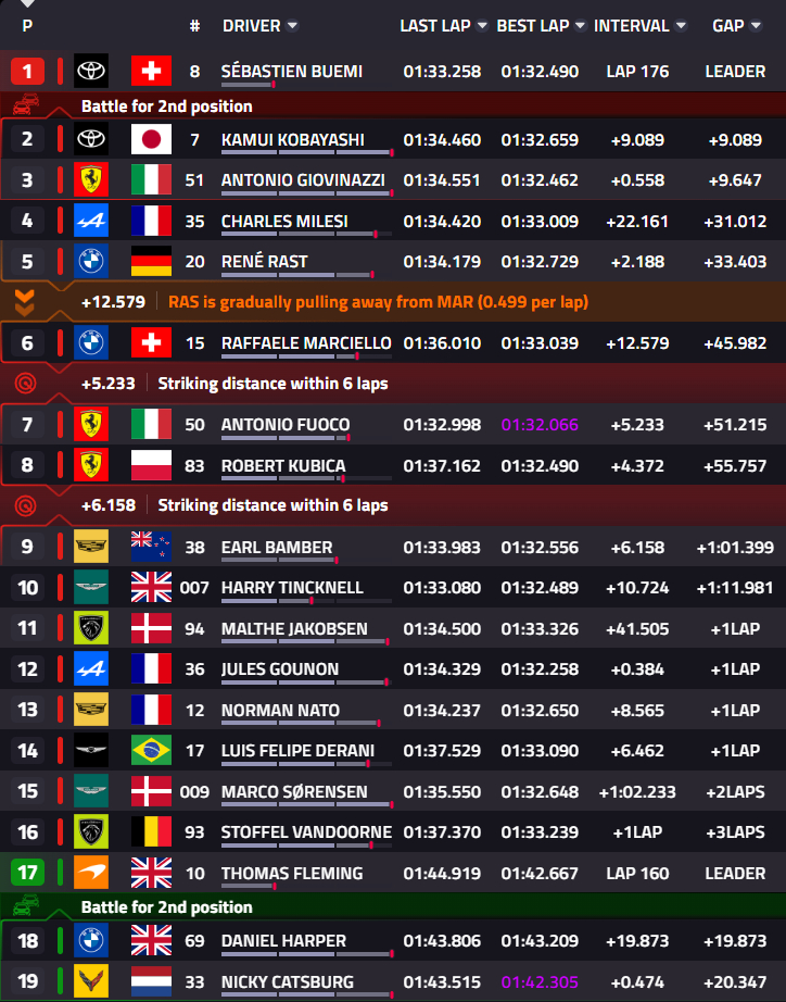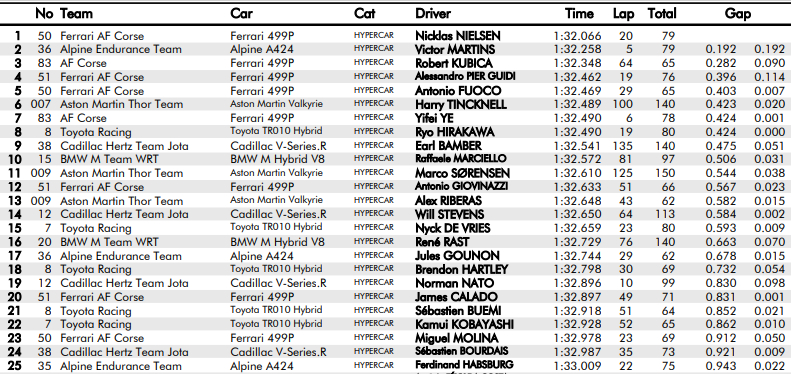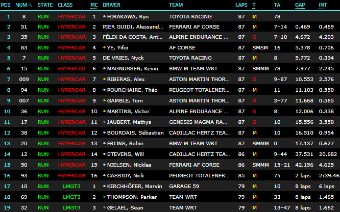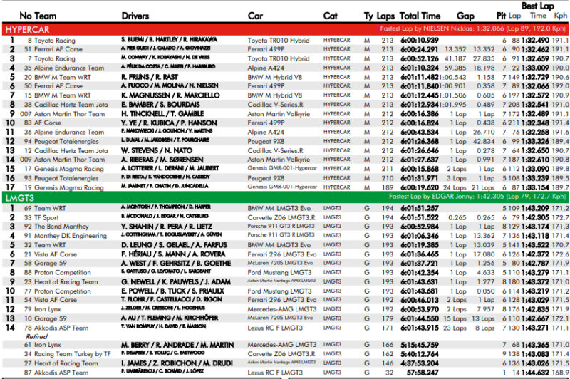 Wyścig wygrała Toyota #8 przed Ferrari #51 i Toyotą #8. W pierwszej 10-tce znalazły się auta 6 różnych producentów, co pokazuje, jak wyrównany jest ten sezon WEC.