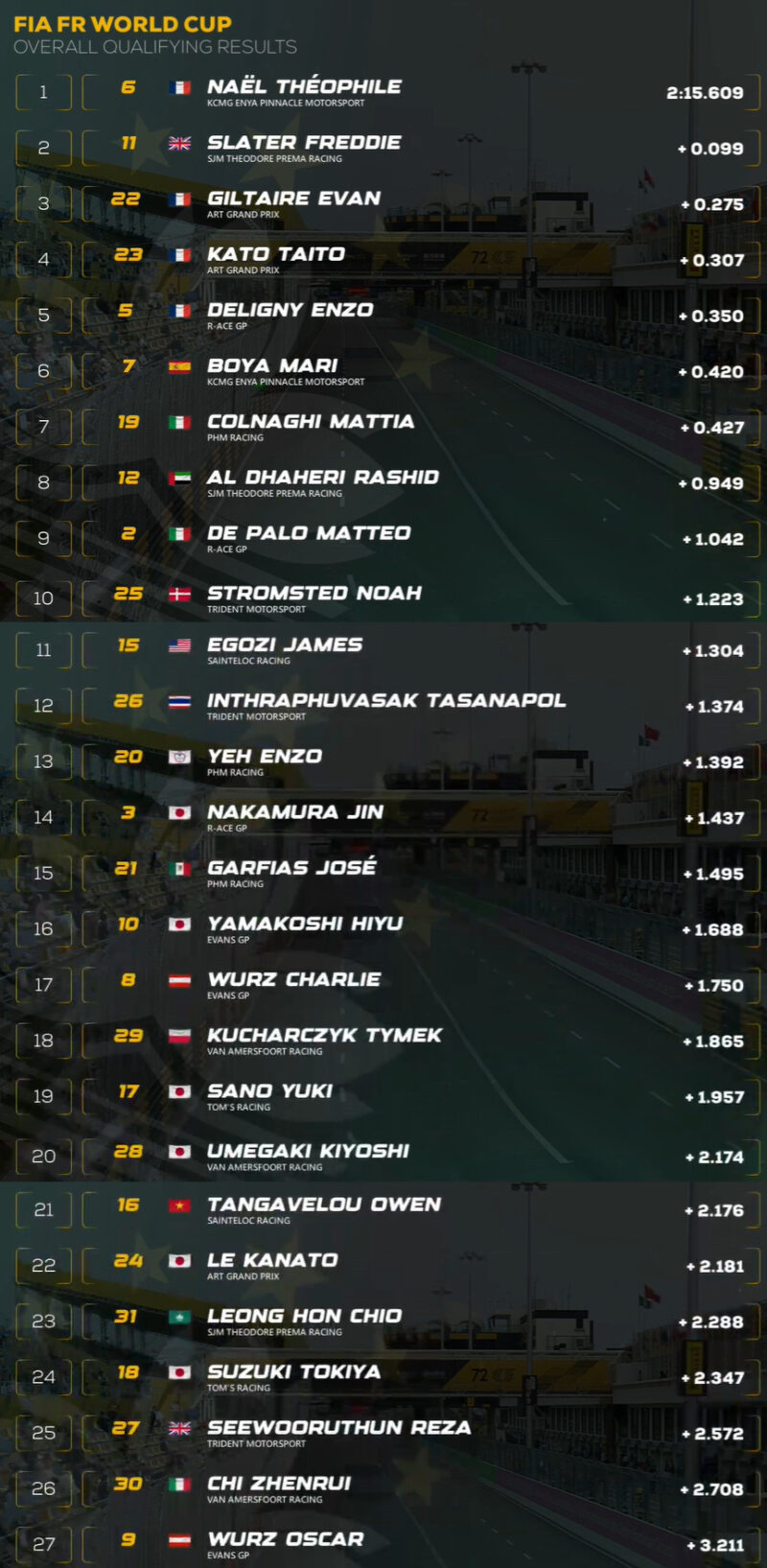 Po zebraniu łącznie wyników 2 sesji, Nael wystartuje z pole position do sobotniego wyścigu kwalifikacyjnego. W pierwszym rzędzie ustawi się też Freddie Slater.