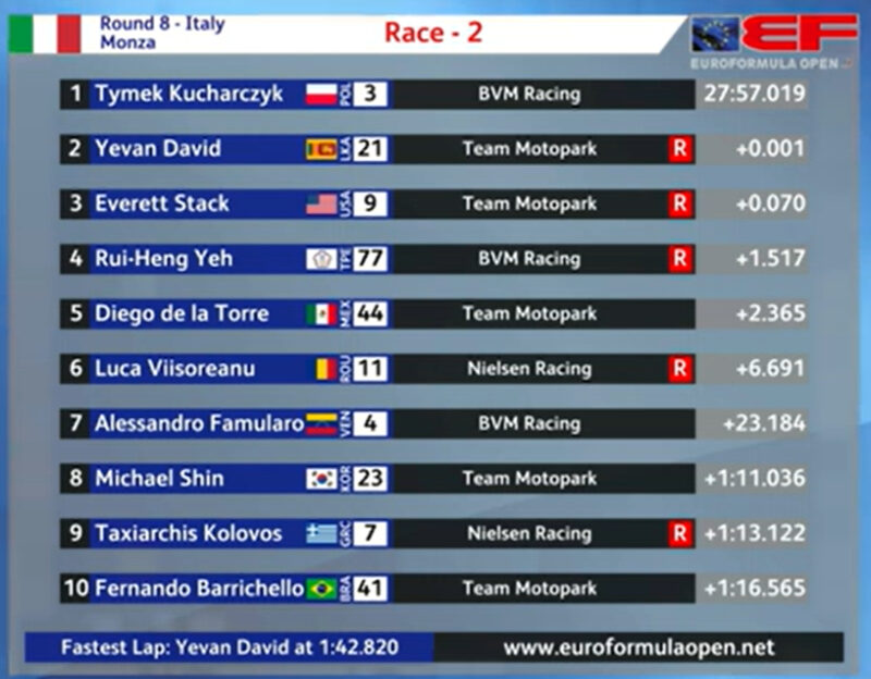 Ten wyścig przejdzie do historii. Nie pamiętam wyścigu w single seaterach, który skończyłby się wygraną kierowcy o 1 tysięczną sekundy. To było zwieńczenie genialnego ścigania przez kilkanaście okrążeń a jego głównym bohaterem był Tymek Kucharczyk. Polak ruszał z 4. miejsca i aby zapewnić soebie mistrzostwo musiał znaleźć się przed startującym z pole position Yevanem Davidem.