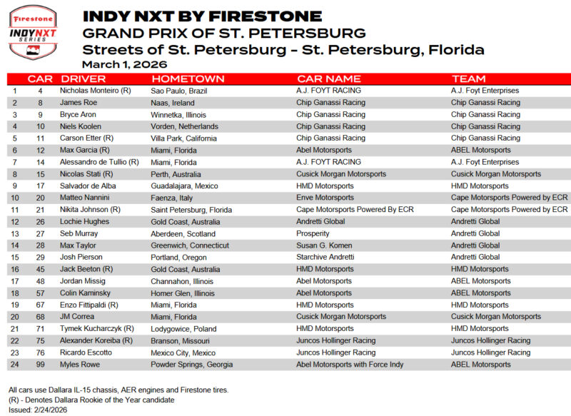 Tymek Kucharczyk będzie jednym z 24 kierowców, którzy przystępują do sezonu IndyNXT. Polak pojedzie w ekipie HMD Motorsports, a jego kolegami będą Salvador de Alba, Jack Beeton i Enzo Fittipaldi. Łącznie zawodników wystawia8 zespołów: