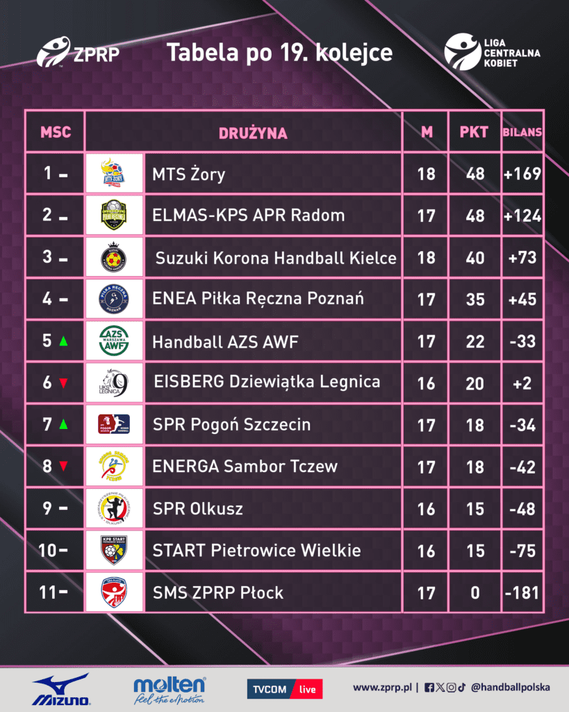Dziewiętnasta kolejka Ligi Centralnej Kobiet wyraźnie uporządkowała ligową rzeczywistość i pokazała, iż sezon wchodzi w decydującą fazę. Coraz więcej wskazuje na to, iż walka o mistrzostwo rozegra się między dwoma zespołami – MTS Żory i ELMAS-KPS APR Radom. Równolegle krystalizuje się sytuacja w środku tabeli oraz na jej dole, gdzie każdy punkt może mieć ogromne znaczenie w kontekście utrzymania. Emocji nie brakowało, a wyniki tej serii gier mogą mieć długofalowe konsekwencje dla końcowego układu tabeli.