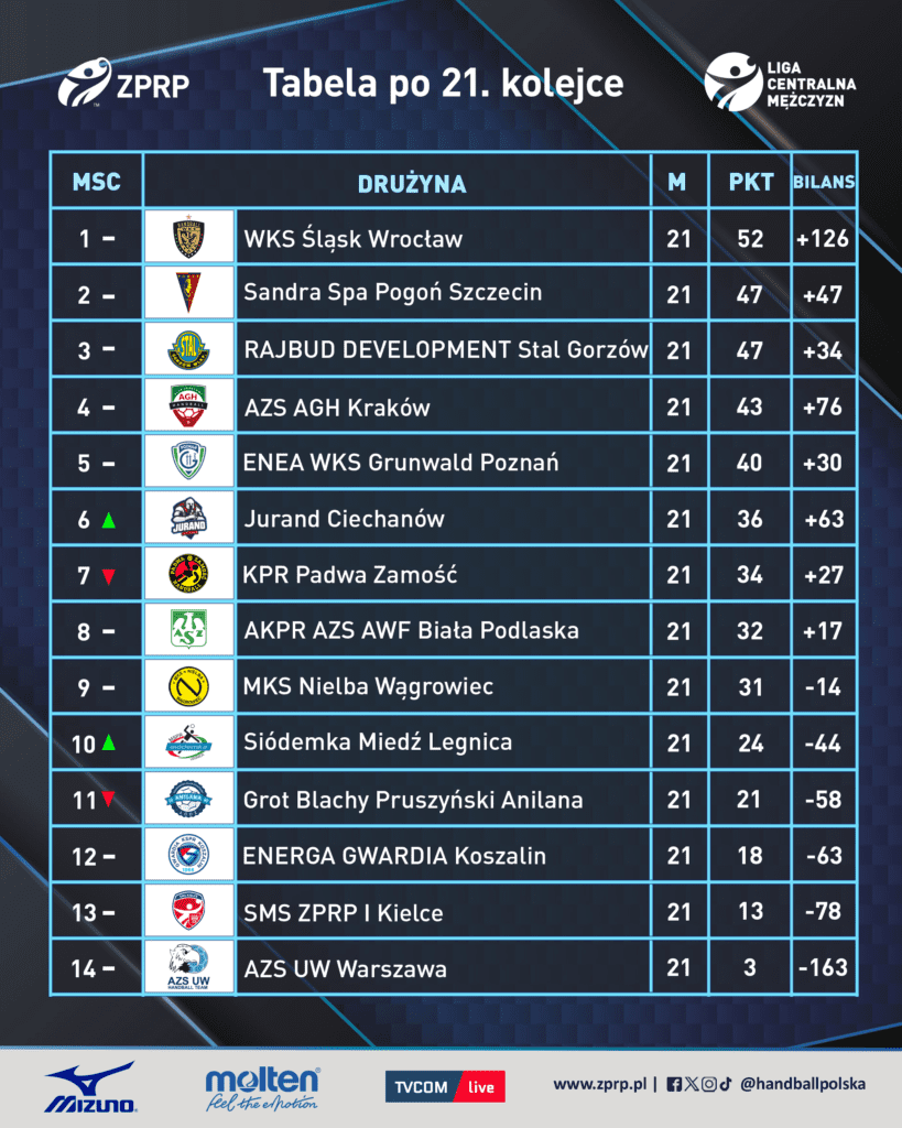 Dwudziesta pierwsza kolejka Ligi Centralnej Mężczyzn przyniosła wszystko, czego można oczekiwać od zaplecza ORLEN Superligi – dramaturgię, niespodzianki i mecze, które mogą mieć najważniejsze znaczenie dla układu tabeli. Na czoło wydarzeń wysuwa się potknięcie Pogoni Szczecin oraz konsekwentny marsz Śląska Wrocław w kierunku awansu. Nie zabrakło także emocji w dolnych rejonach tabeli, gdzie walka o utrzymanie nabiera coraz większego tempa.