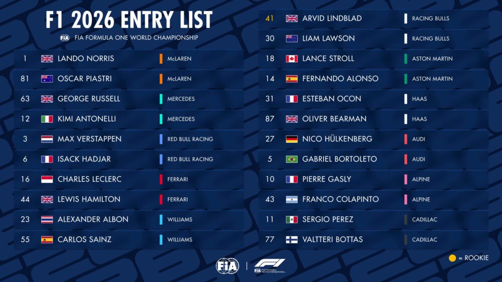 Mamy już listę zgłoszeń kierowców do sezonu 2026 Formuły 1 i wiemy, z jakim numerem będzie jeździł jedyny debiutant w stawce.