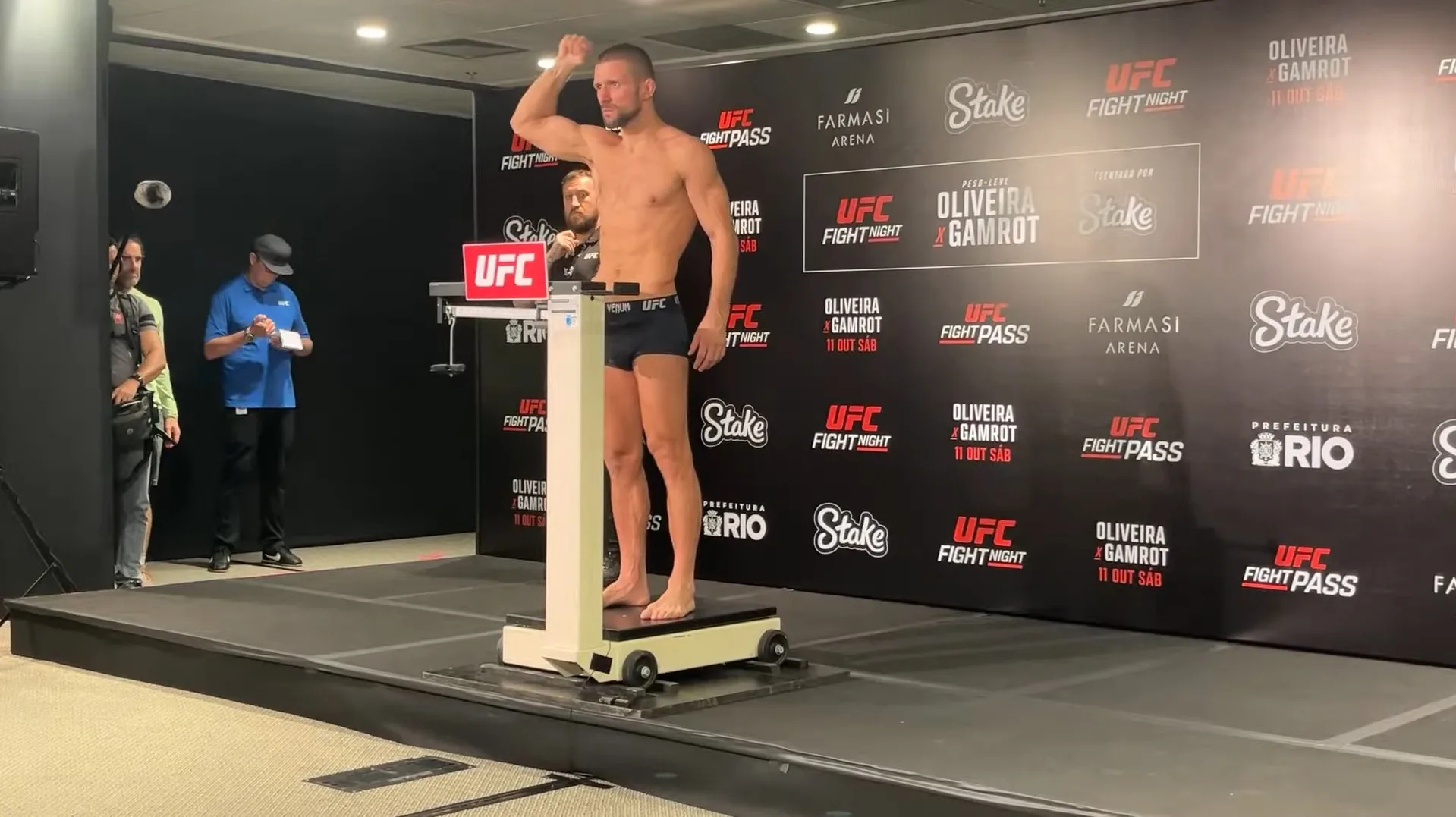 Bohaterowie walki wieczoru, czyli Charles Oliveira i Mateusz Gamrot ważyli tyle samo, czyli 156 funtów. Brazylijczyk pojawił się na wadze jako pierwszy. Polak nieco później, ale również wykonał swój obowiązek wykorzystując przysługujący wszystkim funt tolerancji.