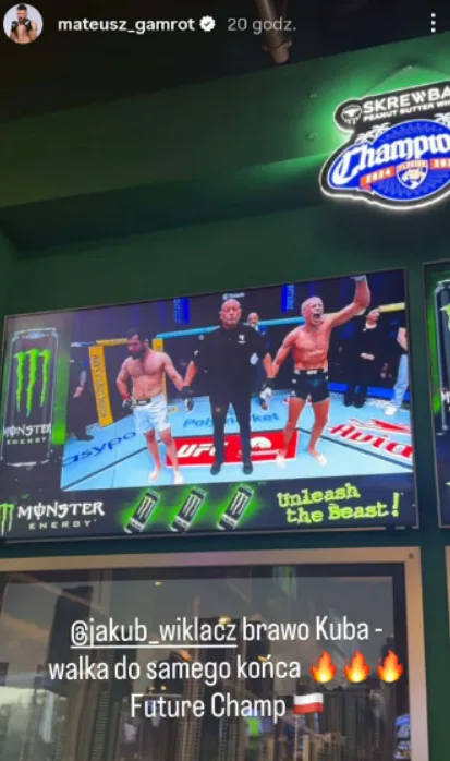 Po walce w stronę Jakuba Wikłacza popłynęło wiele słów uznania, ale szczególnie wymowna była reakcja Mateusza Gamrota. Były mistrz KSW i czołowy zawodnik wagi lekkiej UFC udostępnił relację z walki, w której otwarcie pogratulował Wikłaczowi i podkreślił, iż jest z niego dumny: