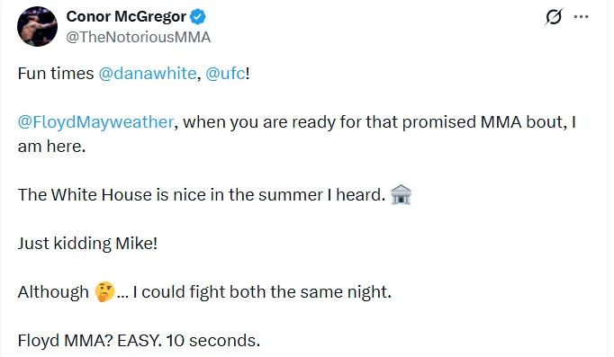 Floyd w MMA? ŁATWIZNA. 10 sekund.” – napisał McGregor na portalu X: