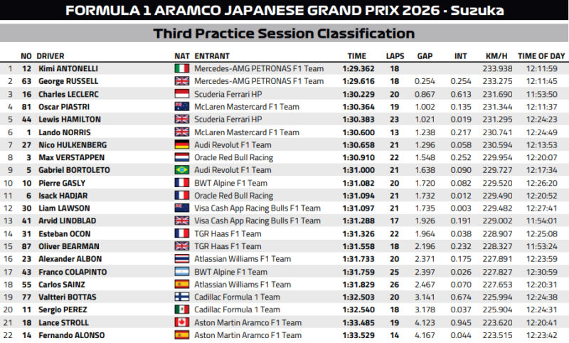 Najszybszym kierowcą sesji był Andrea Kimi Antonelli, tuż przed George Russellem. Tym razem przewaga Mercedesów była bardzo duża. Zobaczcie wyniki: