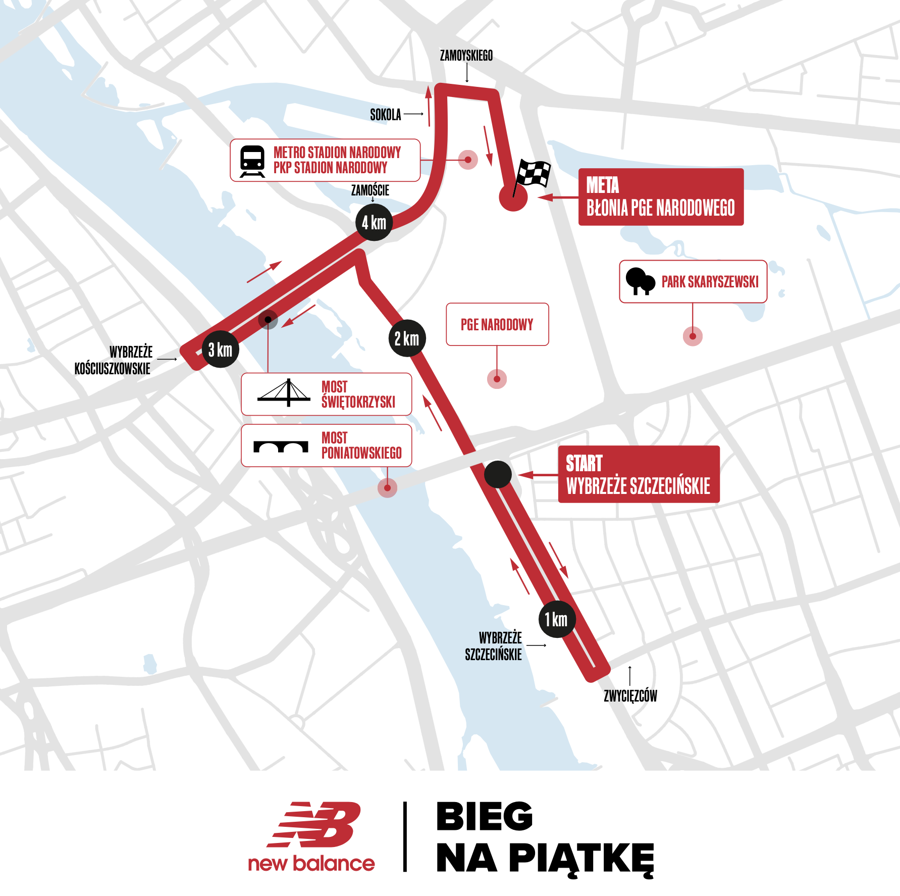 Tegoroczny New Balance Bieg Na Piątkę rozpocznie się na ulicy Wybrzeże Szczecińskie. Najpierw zawodnicy pobiegną w kierunku południowym do ulicy Zwycięzców. Tam zawrócą i skierują wzdłuż Wisły do Mostu Świętokrzyskiego, którym dostaną się na lewy brzeg rzeki. Mniej więcej na wysokości przeprawy będą na półmetku rywalizacji.