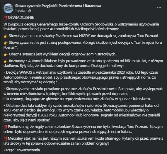Za zamknięciem toru stoją działania Stowarzyszenia Przyjaciół Przeźmierowa i Baranowa. Jeszcze wczoraj cieszyli się oni w poście na Facebooku z zamknięcia toru. Dziś, wobec ogromu wiadomości, Stowarzyszenie opublikowało oświadczenie, próbując przerzucić presję na kogoś innego.