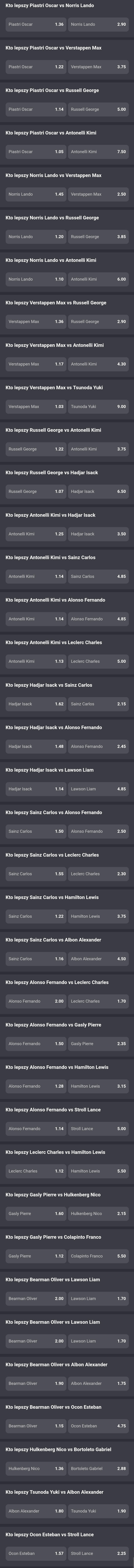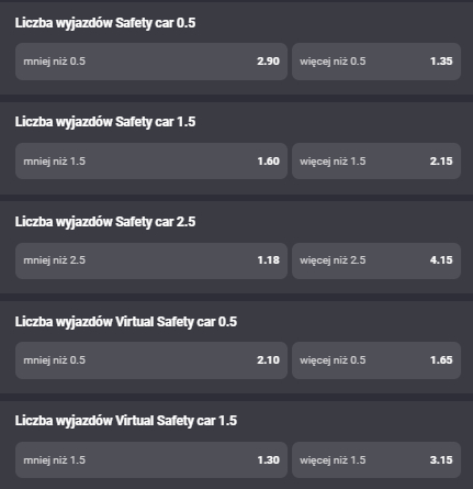 Faworytem rywalizacji jest Oscar Piastri. Kurs na jego zwycięstwo to tylko 1.55 przy 3.4 na Lando Norrisa, startującego z 2. miejsca (brudna strona toru). Na podium powinien znaleźć się też Max Verstappen. (Kliknięcie w grafikę przenosi do strony z kursami).