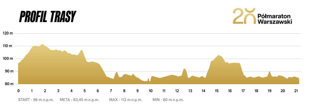 Profil trasy pozostaje sprzyjający szybkiemu bieganiu, choć nie jest całkowicie płaski. Start zlokalizowany jest na wysokości około 96 m n.p.m., najwyższy punkt trasy sięga 112 m n.p.m., a najniższy około 80 m n.p.m. Najbardziej odczuwalne, choć wciąż łagodne różnice wysokości pojawiają się w pierwszej części biegu oraz na odcinkach prowadzących przez przeprawy mostowe. Meta na błoniach PGE Narodowy znajduje się na poziomie około 83,5 m n.p.m., co oznacza lekko opadającą końcówkę sprzyjającą szybkiemu finiszowi.