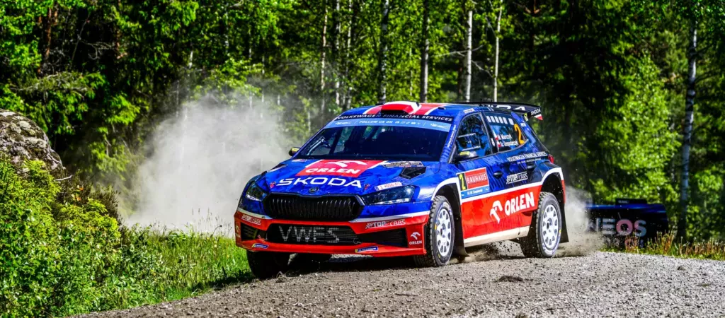 fot. @World / Red Bull Content PoolZ numerem 1 na trasy ruszą Roope Korhonen i Anssi Viinikka. To aktualni mistrzowie Finlandii oraz liderzy mistrzostw Europy, którzy imponują swoim tempem na szutrowych oesach. To jednak nie oni będą na Mazurach rozpatrywani jako główni faworyci do zwycięstwa. Numer 2 na liście zgłoszeń to bowiem Martins Sesks i Renars Francis. Tej załogi w naszym kraju nie trzeba nikomu przedstawiać. To zwycięzcy rajdu z 2023 roku, którzy w 2024 roku zadebiutowali w Mikołajkach w Fordzie Puma Rally1 – podczas rundy WRC – i bez pakietu hybrydowego zajęli wówczas fenomenalne 5. miejsce, wprawiając w zachwyt cały rajdowy świat. Starcie Korhonena z Sesksem to jednocześnie pojedynek dwóch najlepszych rajdowych konstrukcji klasy Rally2, czyli Skody Fabii i Toyoty Yaris. Obie załogi skorzystają z opon MRF.