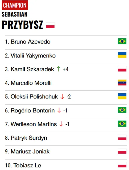 Z roszadami mamy tak naprawdę do czynienia w dwóch rankingach. Jednym z nich jest dywizja kogucia, w której oczywiście króluje mistrz kategorii, Sebastian Przybysz. Za jego plecami niezmiennie znajdują się Bruno Azevedo oraz Vitalii Yakymenko – Ukrainiec zresztą najprawdopodobniej będzie kolejnym rywalem czempiona. Numerem 3 dywizji nie jest już jednak Oleksii Polishchuk. Jego miejsce zajął ten, który go pokonał w Szczecinie, czyli rzecz jasna Kamil Szkaradek. W związku z awansem reprezentanta „Grappling Kraków” spadek odnotowali również Rogerio Bontorin oraz Werlleson Martins.