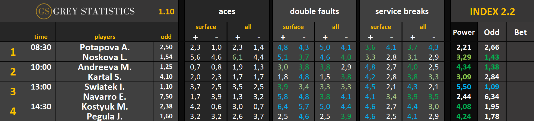 Zapraszamy na codzienną dawkę statystyk dotyczących asów serwisowych, podwójnych błędów i przełamań w spotkaniach ATP & WTA Tour autorstwa Grey Statistics. W tabelach znajdziecie średnie liczby z sezonu, które mogą pomóc w analizie i doborze typów na dany mecz.