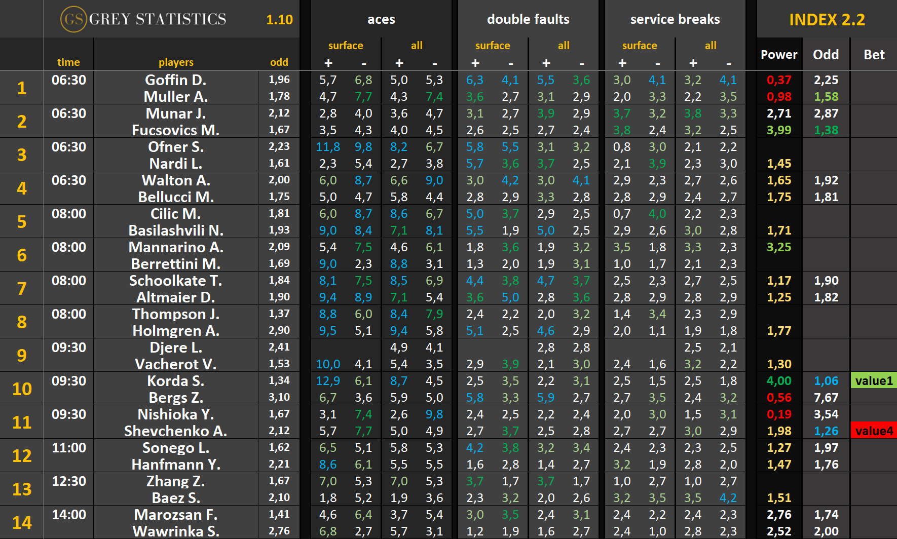Bet – jeżeli kursy wystawione z pomocą indeksów są opłacalne względem kursów u bukmachera, w tej kolumnie pojawi się wartość “value” wraz z cyfrą (im wyższa, tym większe value)