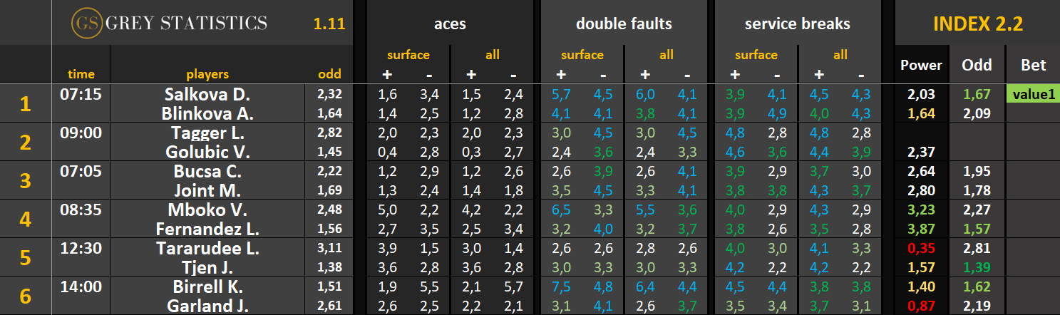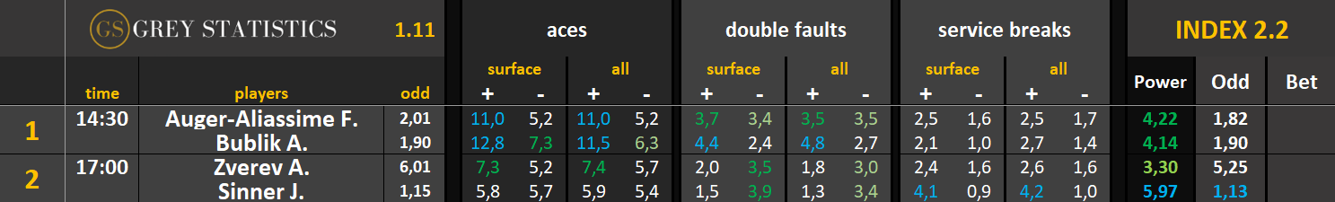 Zapraszamy na codzienną dawkę statystyk dotyczących asów serwisowych, podwójnych błędów i przełamań w spotkaniach ATP & WTA Tour autorstwa Grey Statistics. W tabelach znajdziecie średnie liczby z sezonu, które mogą pomóc w analizie i doborze typów na dany mecz.