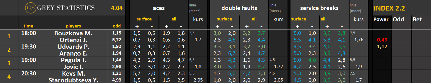 Zapraszamy na codzienną dawkę statystyk dotyczących asów serwisowych, podwójnych błędów i przełamań w spotkaniach ATP & WTA Tour autorstwa Grey Statistics. W tabelach znajdziecie średnie liczby z sezonu, które mogą pomóc w analizie i doborze typów na dany mecz.