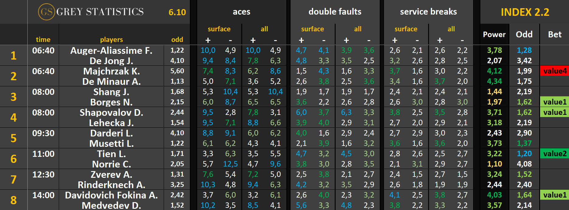 Zapraszamy na codzienną dawkę statystyk dotyczących asów serwisowych, podwójnych błędów i przełamań w spotkaniach ATP & WTA Tour autorstwa Grey Statistics. W tabelach znajdziecie średnie liczby z sezonu, które mogą pomóc w analizie i doborze typów na dany mecz.