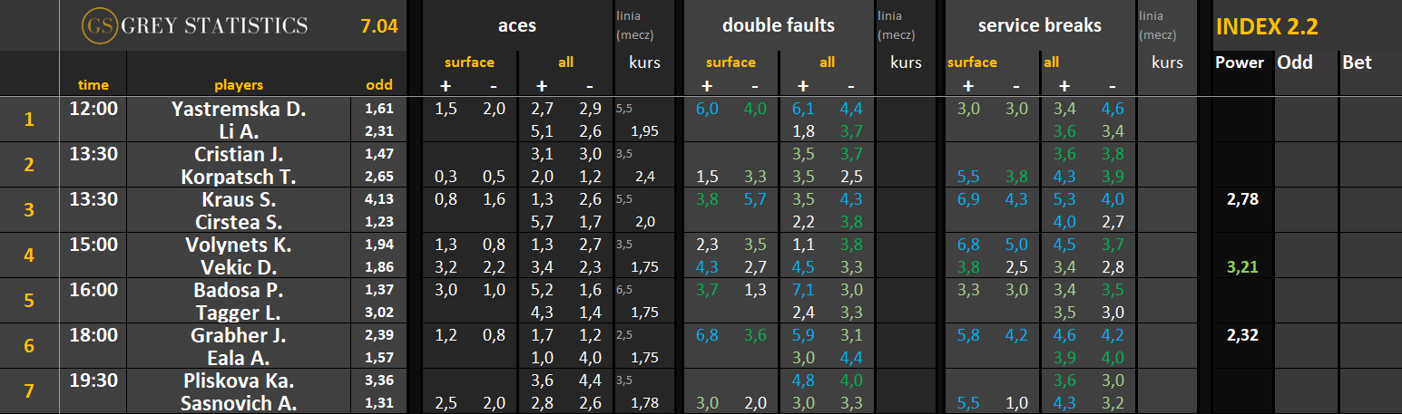 Zapraszamy na codzienną dawkę statystyk dotyczących asów serwisowych, podwójnych błędów i przełamań w spotkaniach ATP & WTA Tour autorstwa Grey Statistics. W tabelach znajdziecie średnie liczby z sezonu, które mogą pomóc w analizie i doborze typów na dany mecz.