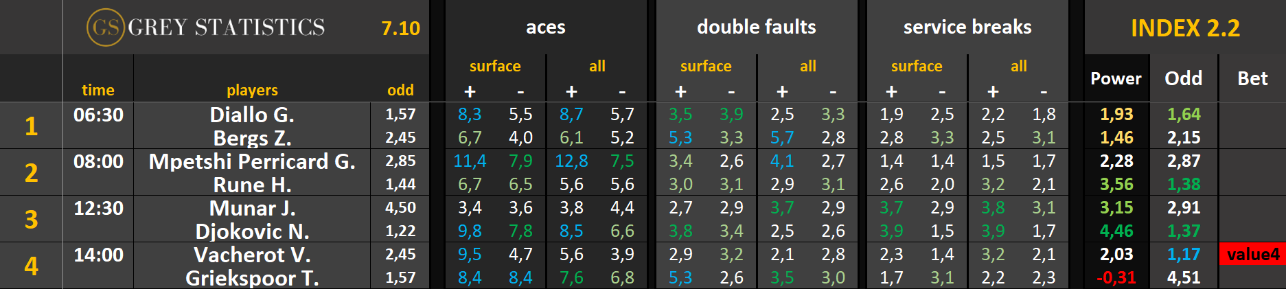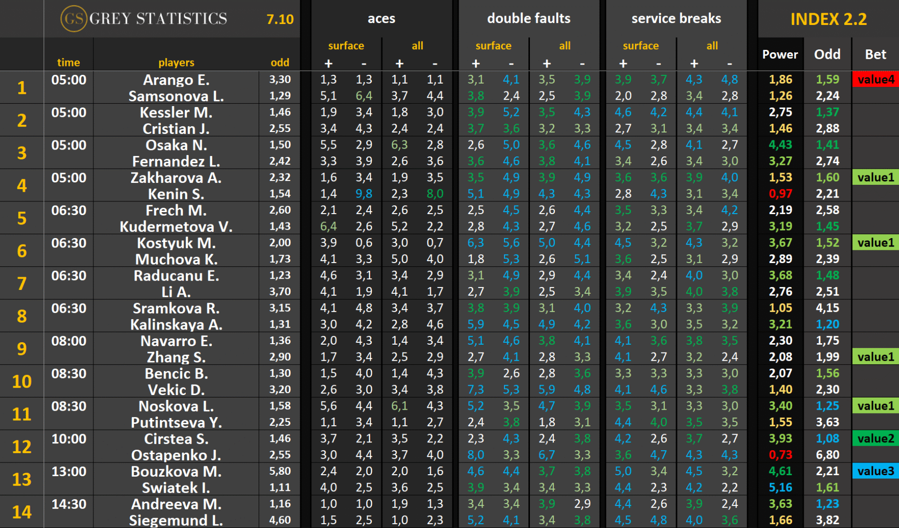 Zapraszamy na codzienną dawkę statystyk dotyczących asów serwisowych, podwójnych błędów i przełamań w spotkaniach ATP & WTA Tour autorstwa Grey Statistics. W tabelach znajdziecie średnie liczby z sezonu, które mogą pomóc w analizie i doborze typów na dany mecz.
