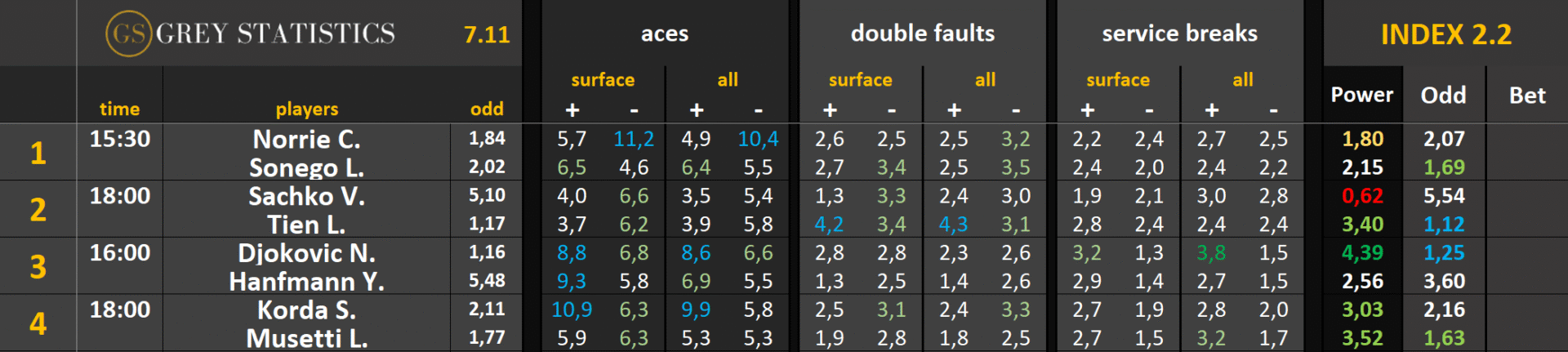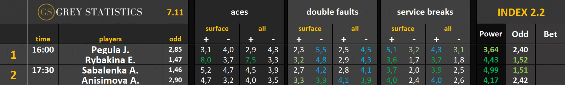Zapraszamy na codzienną dawkę statystyk dotyczących asów serwisowych, podwójnych błędów i przełamań w spotkaniach ATP & WTA Tour autorstwa Grey Statistics. W tabelach znajdziecie średnie liczby z sezonu, które mogą pomóc w analizie i doborze typów na dany mecz.