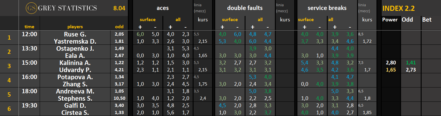 Zapraszamy na codzienną dawkę statystyk dotyczących asów serwisowych, podwójnych błędów i przełamań w spotkaniach ATP & WTA Tour autorstwa Grey Statistics. W tabelach znajdziecie średnie liczby z sezonu, które mogą pomóc w analizie i doborze typów na dany mecz.