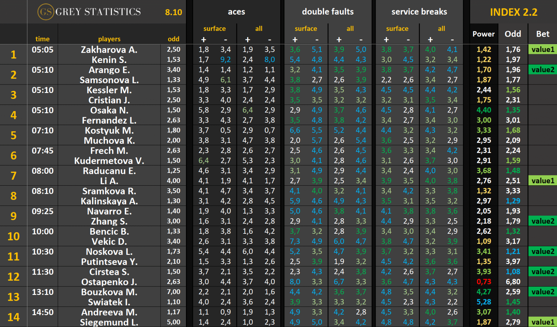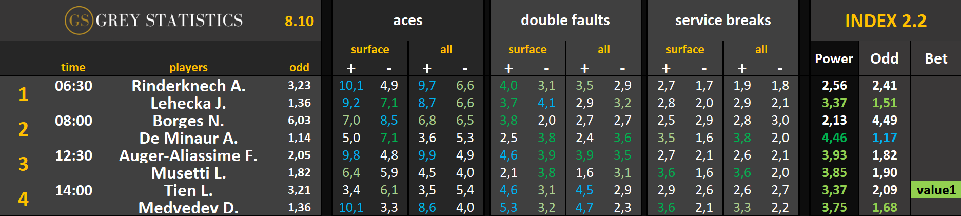 Zapraszamy na codzienną dawkę statystyk dotyczących asów serwisowych, podwójnych błędów i przełamań w spotkaniach ATP & WTA Tour autorstwa Grey Statistics. W tabelach znajdziecie średnie liczby z sezonu, które mogą pomóc w analizie i doborze typów na dany mecz.