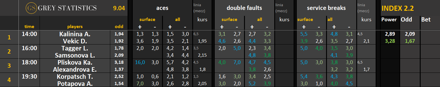 + średnia zdobytych asów/podwójnych błędów/przełamań serwisu