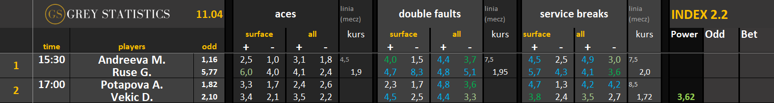 Zapraszamy na codzienną dawkę statystyk dotyczących asów serwisowych, podwójnych błędów i przełamań w spotkaniach ATP & WTA Tour autorstwa Grey Statistics. W tabelach znajdziecie średnie liczby z sezonu, które mogą pomóc w analizie i doborze typów na dany mecz.