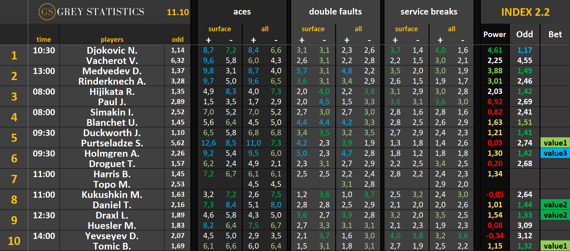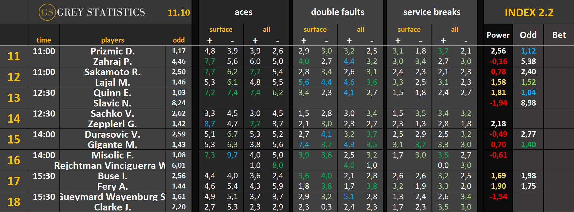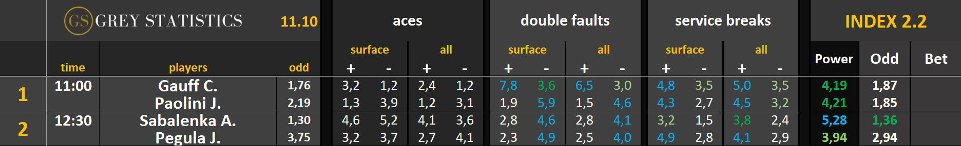 Zapraszamy na codzienną dawkę statystyk dotyczących asów serwisowych, podwójnych błędów i przełamań w spotkaniach ATP & WTA Tour autorstwa Grey Statistics. W tabelach znajdziecie średnie liczby z sezonu, które mogą pomóc w analizie i doborze typów na dany mecz.