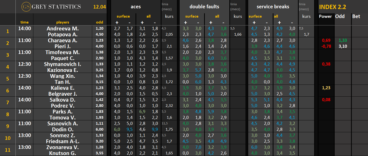 Zapraszamy na codzienną dawkę statystyk dotyczących asów serwisowych, podwójnych błędów i przełamań w spotkaniach ATP & WTA Tour autorstwa Grey Statistics. W tabelach znajdziecie średnie liczby z sezonu, które mogą pomóc w analizie i doborze typów na dany mecz.