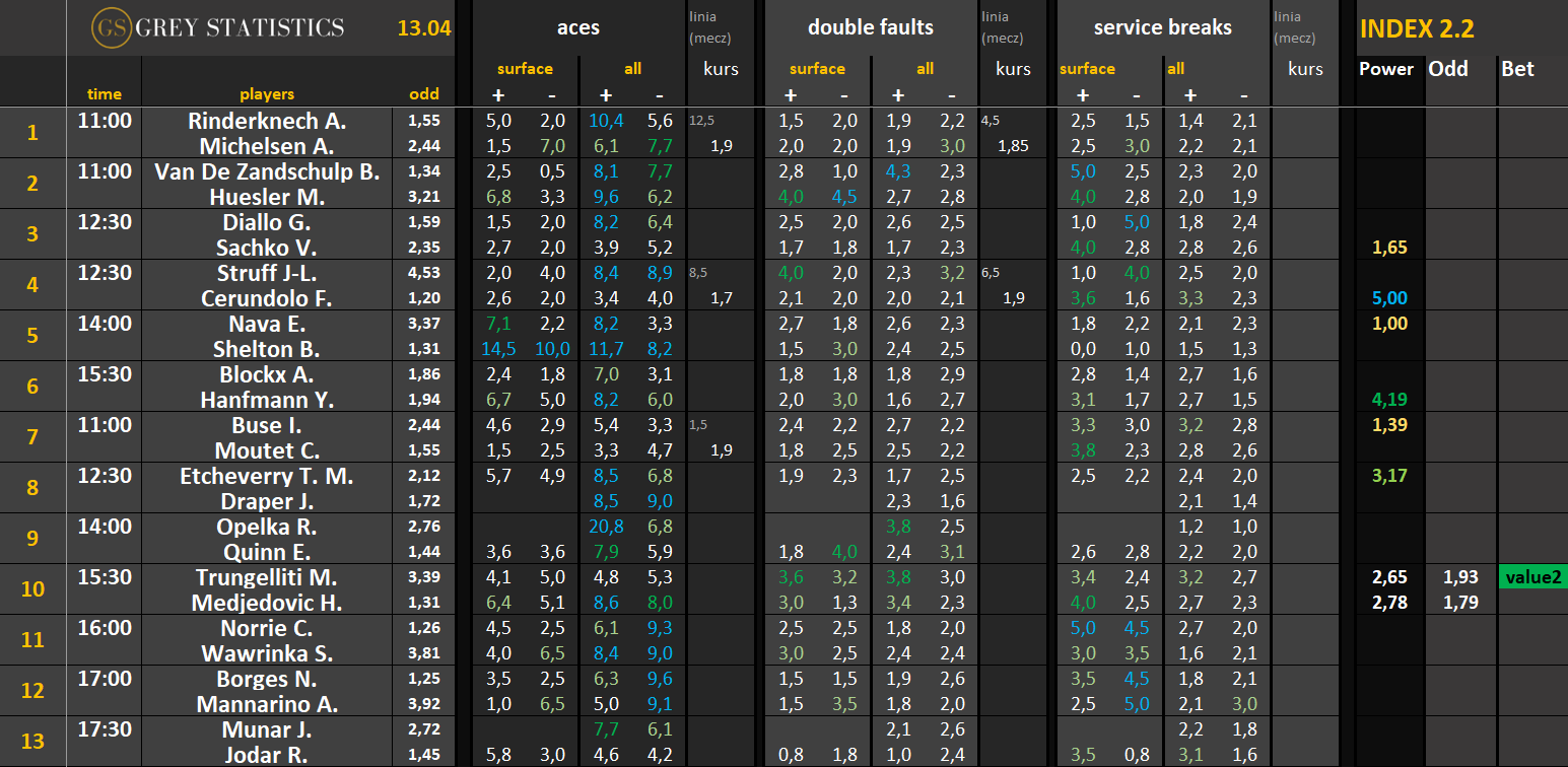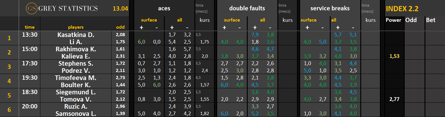 Zapraszamy na codzienną dawkę statystyk dotyczących asów serwisowych, podwójnych błędów i przełamań w spotkaniach ATP & WTA Tour autorstwa Grey Statistics. W tabelach znajdziecie średnie liczby z sezonu, które mogą pomóc w analizie i doborze typów na dany mecz.